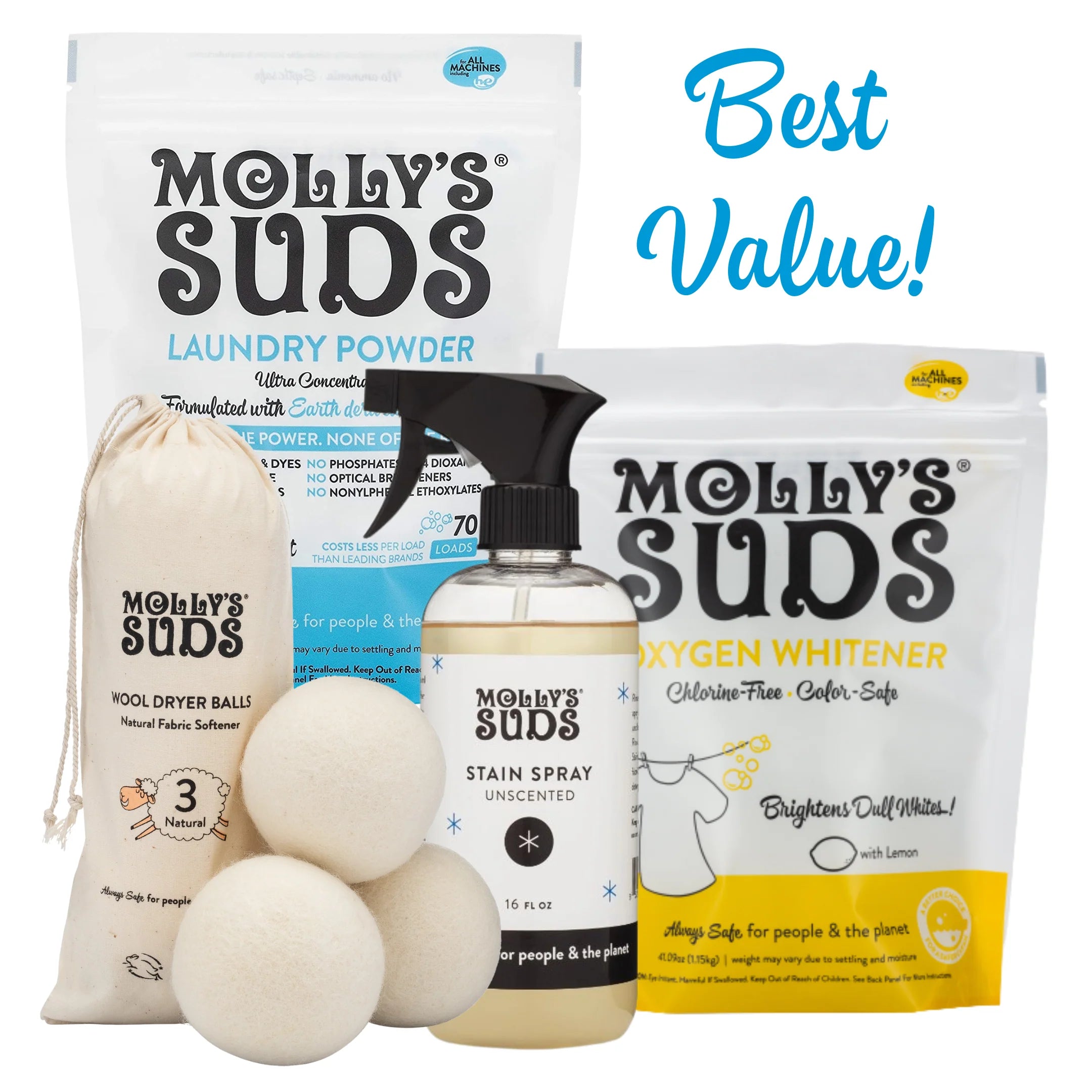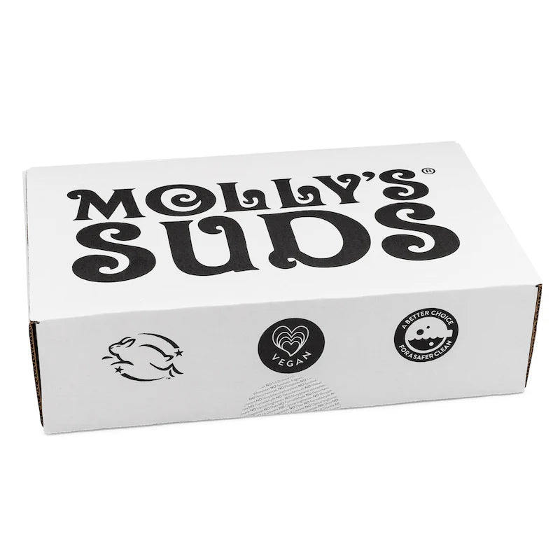 Molly’s Suds Clean Laundry Starter Kit does NOT include: Synthetic Fragrances, Formaldehyde & 1,4-Dioxane, Optical Brighteners, Synthetic Nonylphenol Ethoxylates, Phosphates, Chlorine, Sodium Laureth Sulfate (SLES), Phthalates, Parabens, Methylisothiazolinone, Cocamide DEA