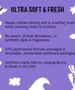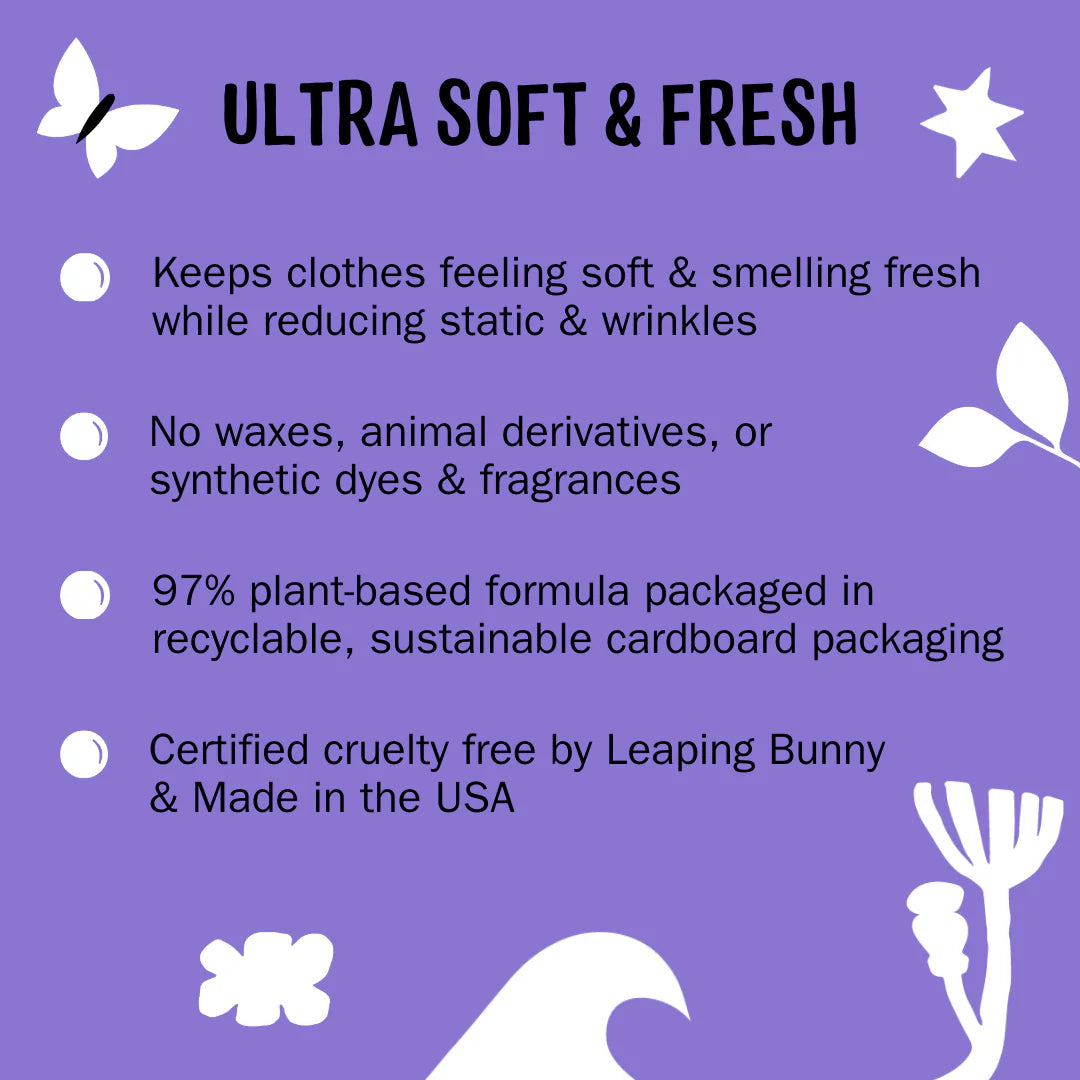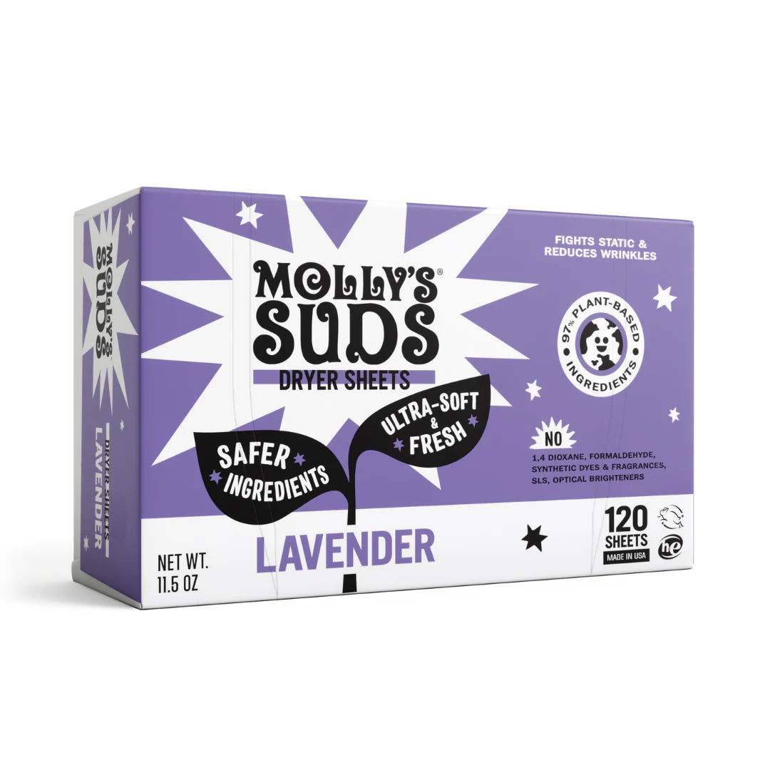 Molly’s Suds Plant-Based Fabric Softener Dryer Sheets do not contain: Synthetic Fragrances, Formaldehyde & 1,4-Dioxane, Optical Brighteners, Synthetic Nonylphenol Ethoxylates, Phosphates, Chlorine, Sodium Laureth Sulfate (SLES), Phthalates, Parabens, Methylisothiazolinone, Cocamide DEA